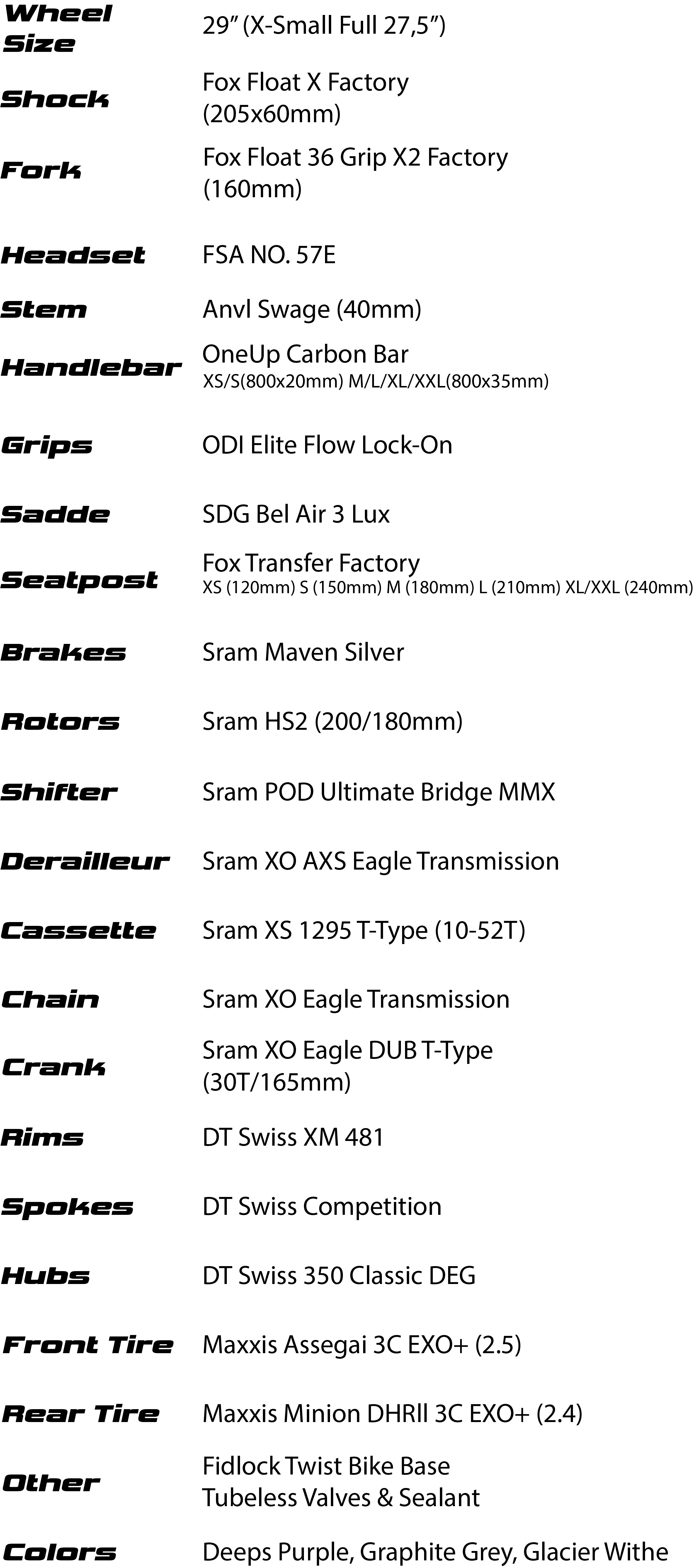 Vollständige Kit -Spezifikationen
